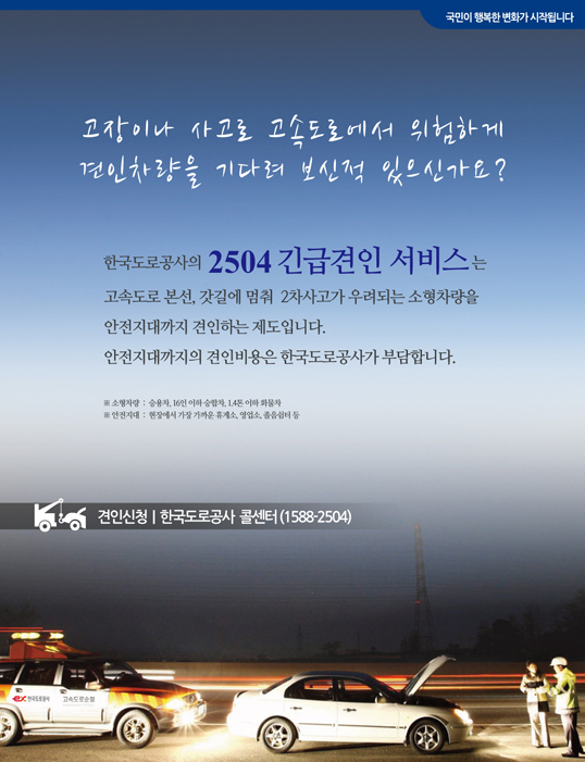 이 서비스는 승용차, 16인승 이하 승합차, 1.4톤 이하 화물차에 한해 제공되며, 콜센터 1588-2504번으로 연락하면 됩니다. 단, 서비스는 안전지대까지만 제공되므로 이 점 참고하시기 바랍니다. 안전지대는 현장에서 가장 가까운 휴게소, 영업소, 졸음쉼터 등을 말합니다.