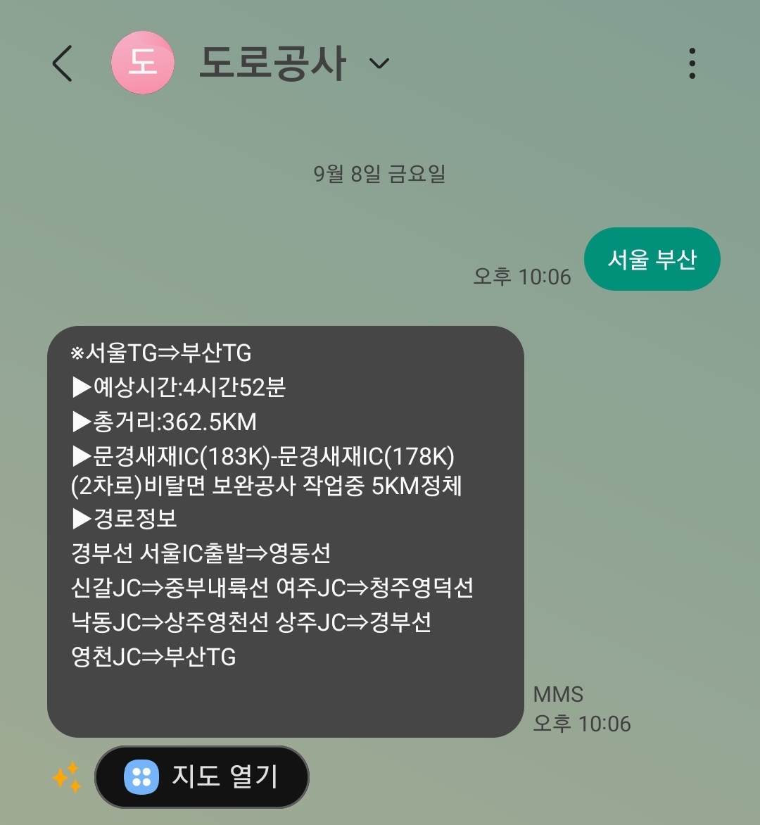 예: 서울 출발, 부산 도착 시 '서울 부산'으로 문자를 보내면 위와 같이 예상 도착시간, 총거리, 혼잡 구간 등의 정보를 받을 수 있습니다.