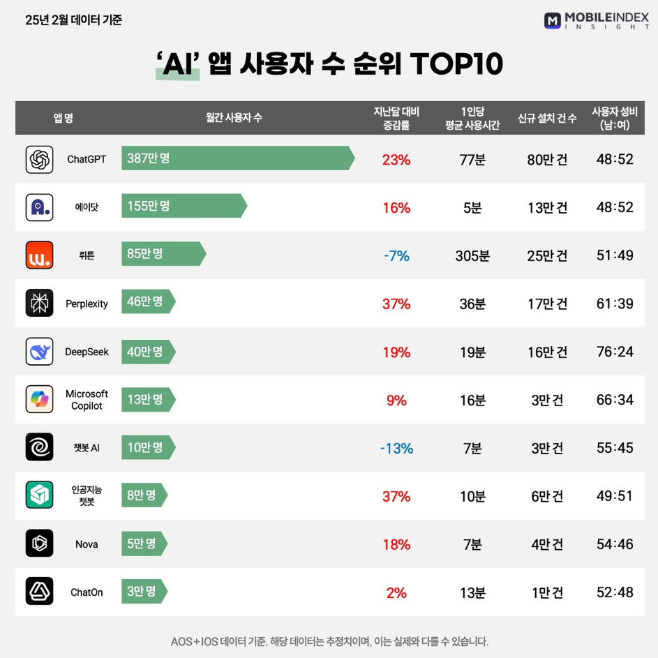 - 3월 첫째 주 기준, 세대별 AI 앱 사용자 TOP 5에 여전히 포함